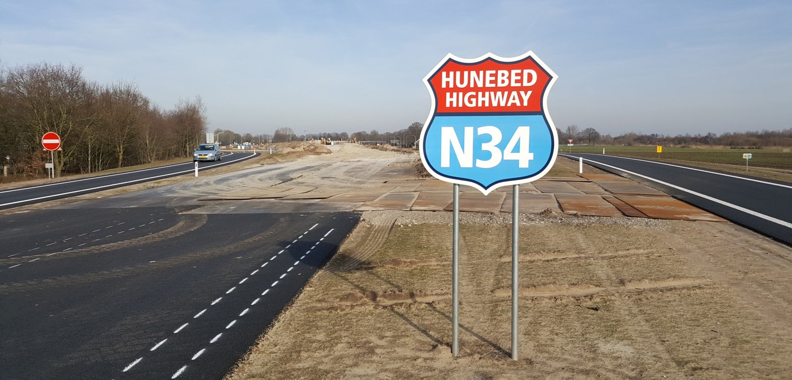 Bedenker van de naam Hunebed Highway en voorzitter van de Hunebed Highway Business Club(!) is overigens niemand minder dan de directeur van het Hunebedcentrum in Borger. Hij was tien jaar geleden al gekomen op de samenstelling van “het typisch Drentse woord hunebedden” met “het typische Amerikaanse woord highway”, omdat hij er altijd rijdt met Amerikaanse liedjes door de luidsprekers.