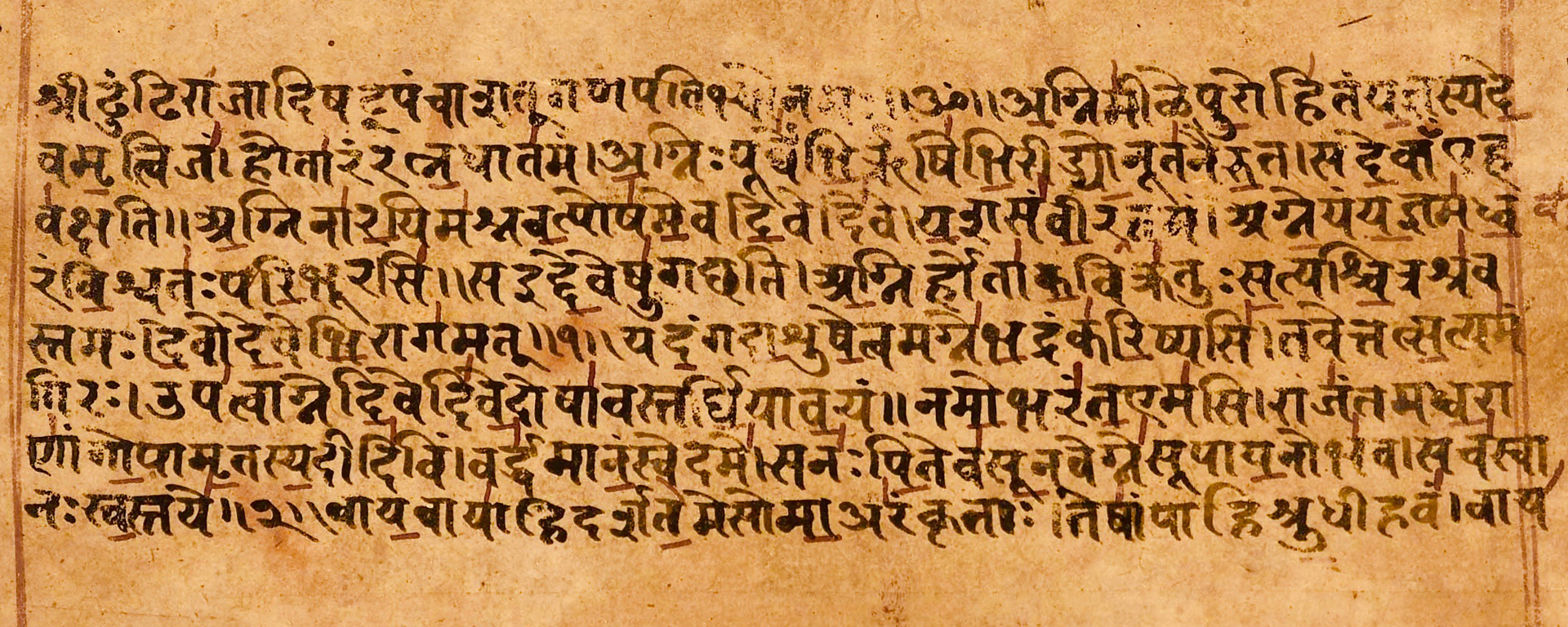 Eerste bladzijde van een handschrift van de Ṛgvedá, verzorgd door Sarah Welch (bewerkt). Enige rechten voorbehouden.