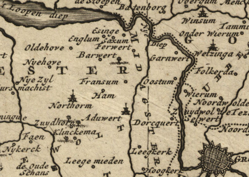 Uitsnede van een kaart uit 1712-14, beschikbaar gesteld door Beeldbank Groningen. Rechtenvrij.