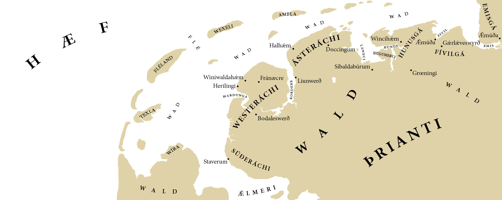 In die tijd reikte de wereld de Friezen nog vele mijlen verder naar het zuidwesten en oosten, doch meestal niet ver landinwaarts. Vandaar heet een deel van Noord-Holland nu nog altijd West-Friesland, staat de streek over de grens bij Groningen nog immer als Oost-Friesland bekend en drukt ginder nog Noord-Friesland tegen Denemarken aan.
