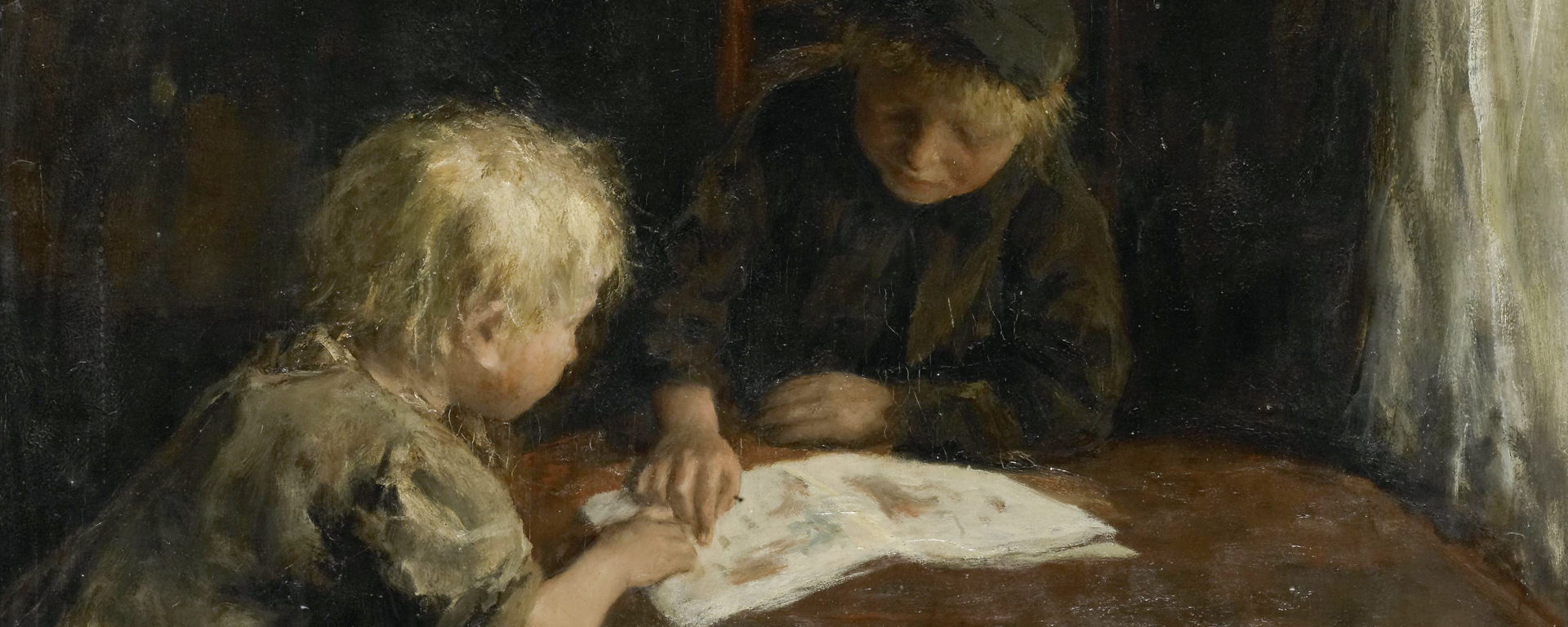 Uitsnede van Kinderen met een prentenboek (1880–1910) door Jacob Simon Hendrik Kever, beschikbaar gesteld door het Rijksmuseum. Rechtenvrij.