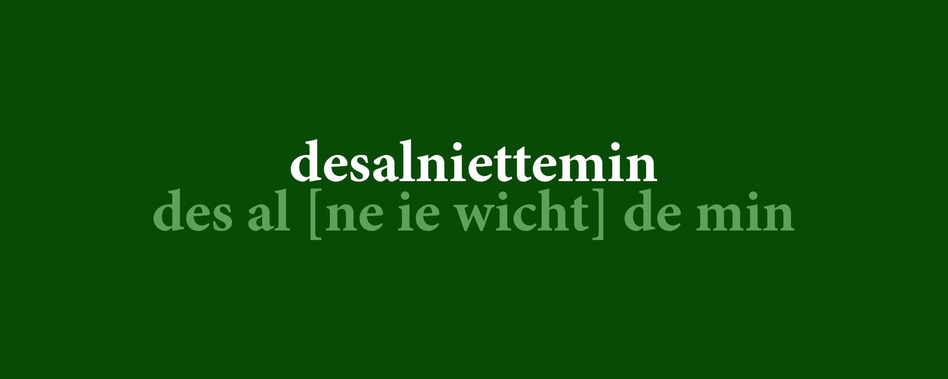 desalniettemin = des al niet de min ‘vandaar geheel niet ermee minder’ (= des al ne ie wicht de min ‘vandaar geheel niet ooit een ding ermee minder’)