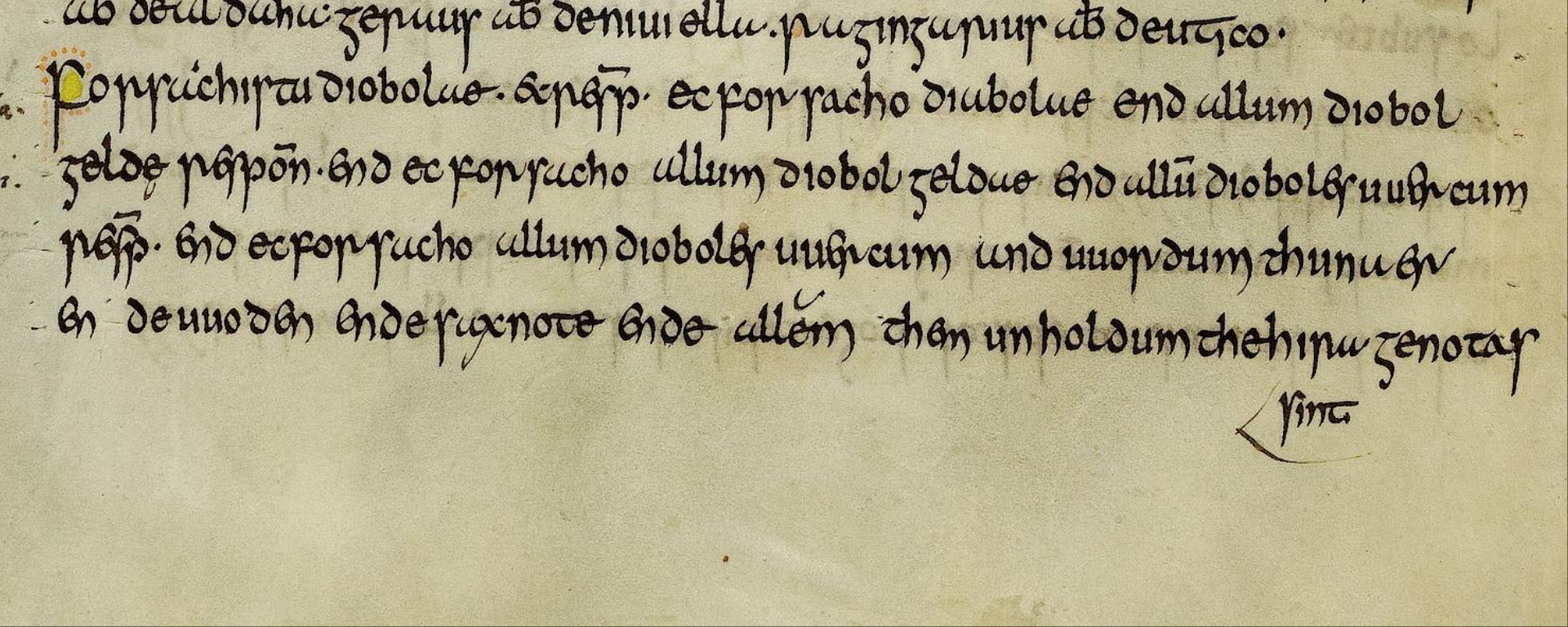 Forsachistu diobolae? Et respondeat: ec forsacho diobolae. End allum diobolgeldę? Respondeat: end ec forsacho allum diobolgeldae. End allum dioboles wercum? Respondeat: end ec forsacho allum dioboles wercum and wordum, Thunaer ende Woden ende Saxnote ende allum them unholdum, the hira genotas sint.